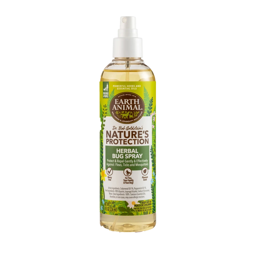 Formulated by Dr. Bob Goldstein, our Nature’s Protection™ Flea & Tick Herbal Bug Spray is infused with a natural blend of aromatic herbs and essential oils that have a fresh, minty fragrance. The preventative power and minty scent of these gentle oils are non-offensive to people and dogs, but loathed by fleas, ticks, and mosquitoes. Our spray is great for hikes, long walks, romps on the beach, boating, or simply lazy days in the yard. We suggest spraying the paws, underbelly, and gently mist the back and neck, daily. You should reapply if your dog swims. Shake well before use to activate the oils. The spray is safe for people too, especially kids, if used as directed.