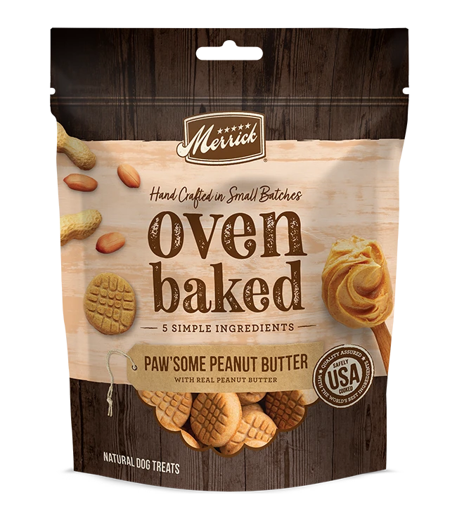 Merrick Oven Baked Treats are hand crafted in small batches with a delicious oven baked smell and taste! These fun shaped biscuits provide the crunch your dog craves and are made with ingredients you can feel good about.