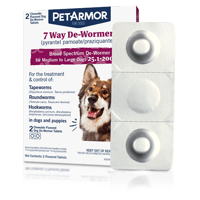 PetArmor 7 Way De-Wormer (Pyrantel Pamoate and Praziquantel) for Medium and Large Dogs treats and controls seven species of worms: two tapeworms (Dipylidium caninum and Taenia pisiformis), two roundworms (Toxocara canis and Toxascaris leonina) and three hookworms (Ancylostoma caninum, Ancylostoma braziliense and Uncinaria stenocephala). This broad spectrum de-wormer comes in chewable tablets, making it easy and convenient to give to your dog.