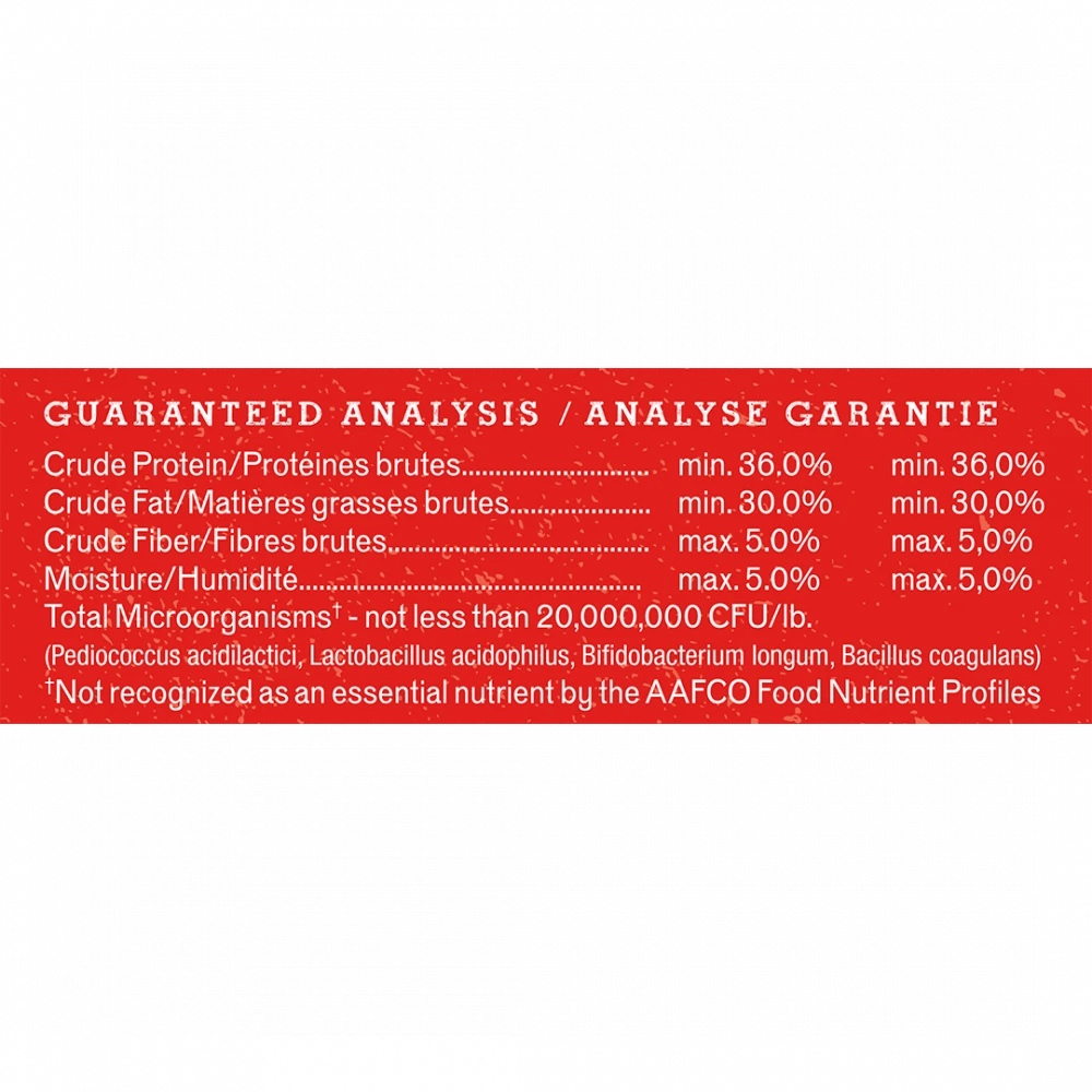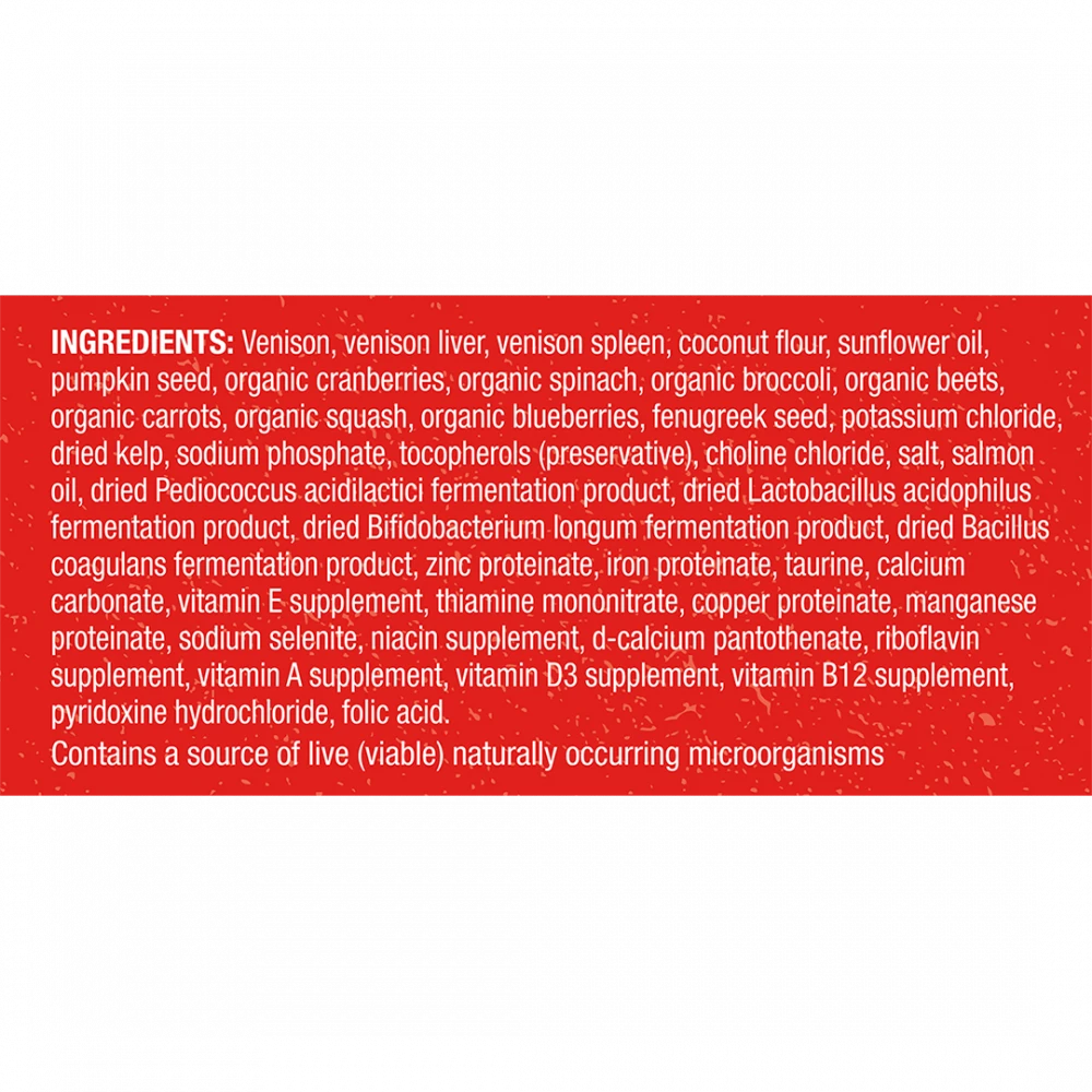Ingredients: Venison, venison liver, venison spleen, coconut flour, sunflower oil, pumpkin seed, organic cranberries, organic spinach, organic broccoli, organic beets, organic carrots, organic squash, organic blueberries, fenugreek seed, potassium chloride, dried kelp, sodium phosphate, tocopherols (preservative), choline chloride, salt, salmon oil, dried Pediococcus acidilactici fermentation product, dried Lactobacillus acidophilus fermentation product, dried Bifidobacterium longum fermentation product, dried Bacillus coagulans fermentation product, zinc proteinate, iron proteinate, taurine, calcium carbonate, vitamin E supplement, thiamine mononitrate, copper proteinate, manganese proteinate, sodium selenite, niacin supplement, d-calcium pantothenate, riboflavin supplement, vitamin A supplement, vitamin D3 supplement, vitamin B12 supplement, pyridoxine hydrochloride, folic acid.