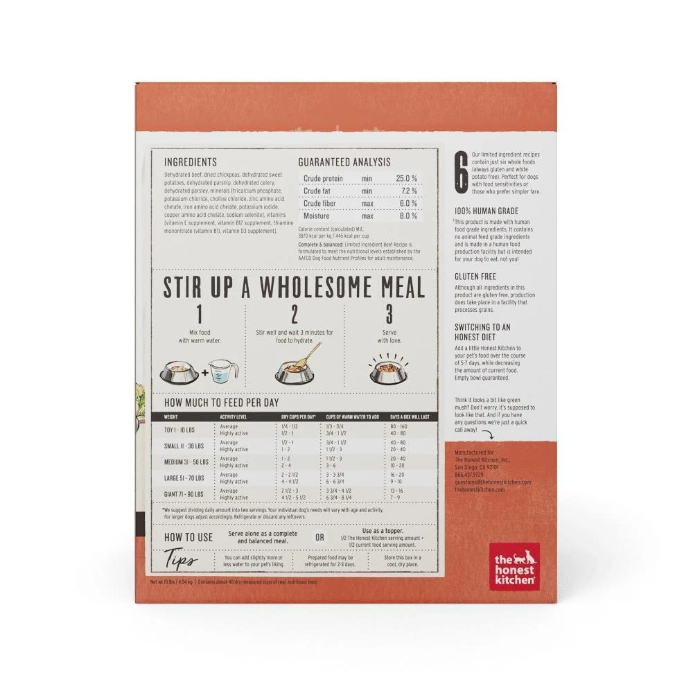 Give your dog the ultimate human treatment by serving 100% human-grade and filler/by-product/preservative-free meals. This simple recipe is easy on the digestive tract and on the taste budsโฆ and itโs also proof that less is more with only six grain-free ingredients uniting to form a complete and balanced mealโincluding ranch-raised beef, wholesome chickpeas, and a healthy dose of soluble fiber, good fat, and irresistible flavor. Whether your hound has dozens of food sensitivities or just appreciates the simple things in life, this is perfect for dogs at all stages of life. Thereโs no beef to be had with this beef!