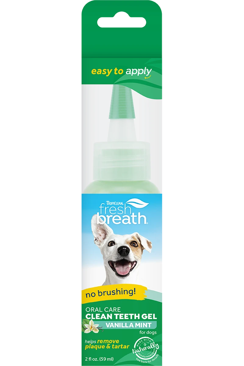 Oral care is about more than making your pets’ smiles sparkle—it’s an important component of their overall health. In fact, 80% of dogs begin to show signs of oral disease by age 3. Our Fresh Breath Clean Teeth Oral Care Gel Vanilla Mint has a unique blend of powerful, natural ingredients that removes and defends against plaque and tartar, providing fresh breath in fun flavors that dogs love! Clean teeth, fresh breath, no brushing!